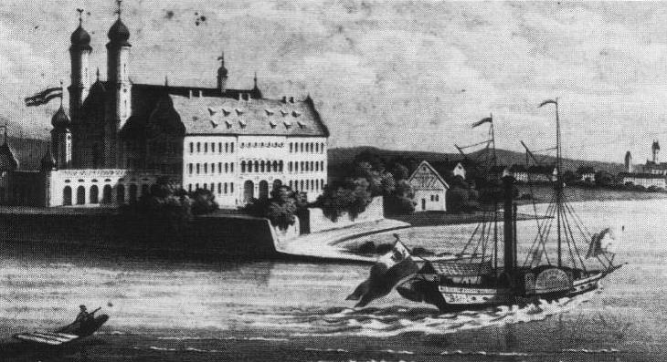 Das Dampfboot Königin von Württemberg vor dem Friedrichshafener Schloß (Bild: Archiv Bodenseeschifffahrt.de) zurück